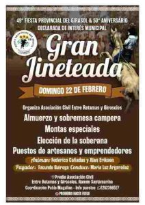 El domingo 22 de Febrero en el predio de la Asociación Civil Entre Retamas y Girasoles de Ramón Santamarina, Gran Jineteada y almuerzo campero.